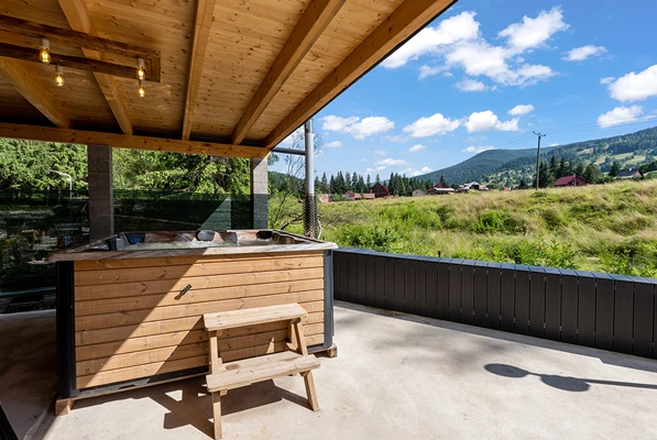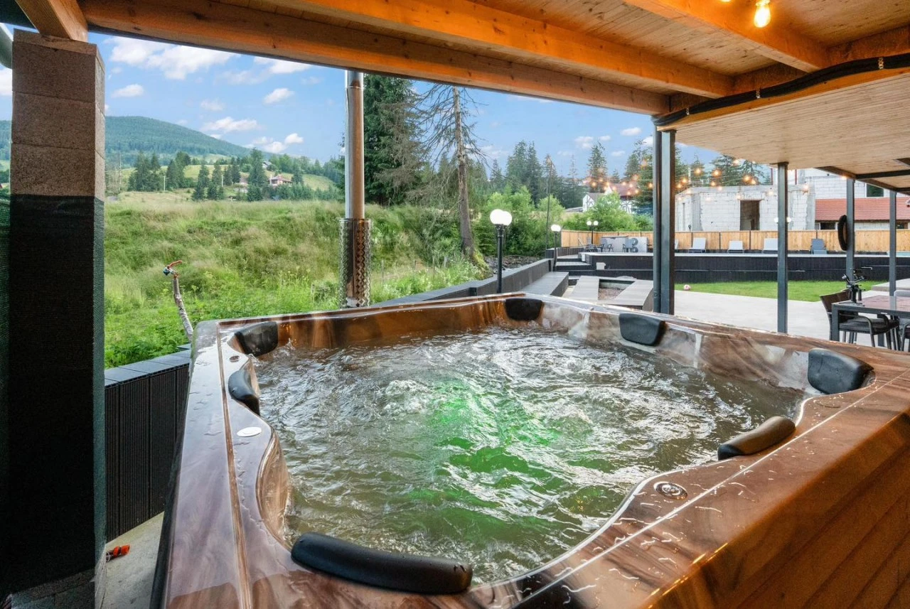 Jacuzzi exterior incalzit si piscina, cu vedere panoramica spre munti.