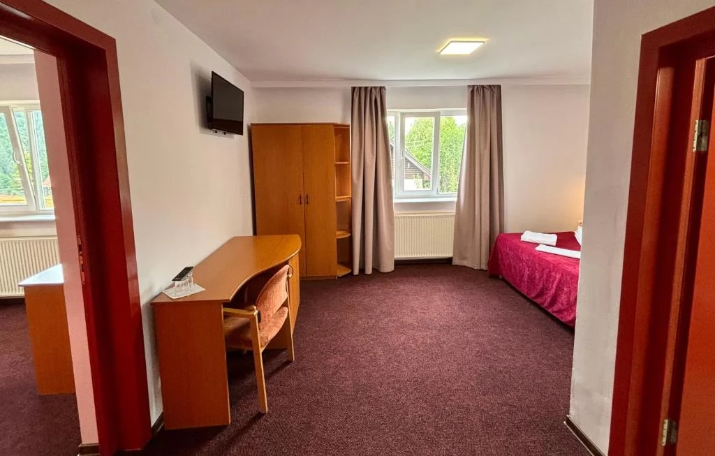 3 apartamente (4 persoane, living cu canapea și dormitor cu pat matrimonial), 12 camere duble (cu posibilitate de pat suplimentar), cu baie proprie.