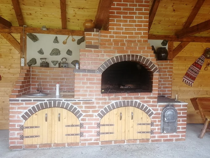 - Foișor rustic cu grătar, plită, chiuvetă și loc de servire