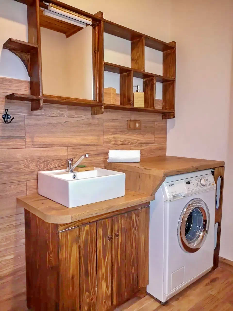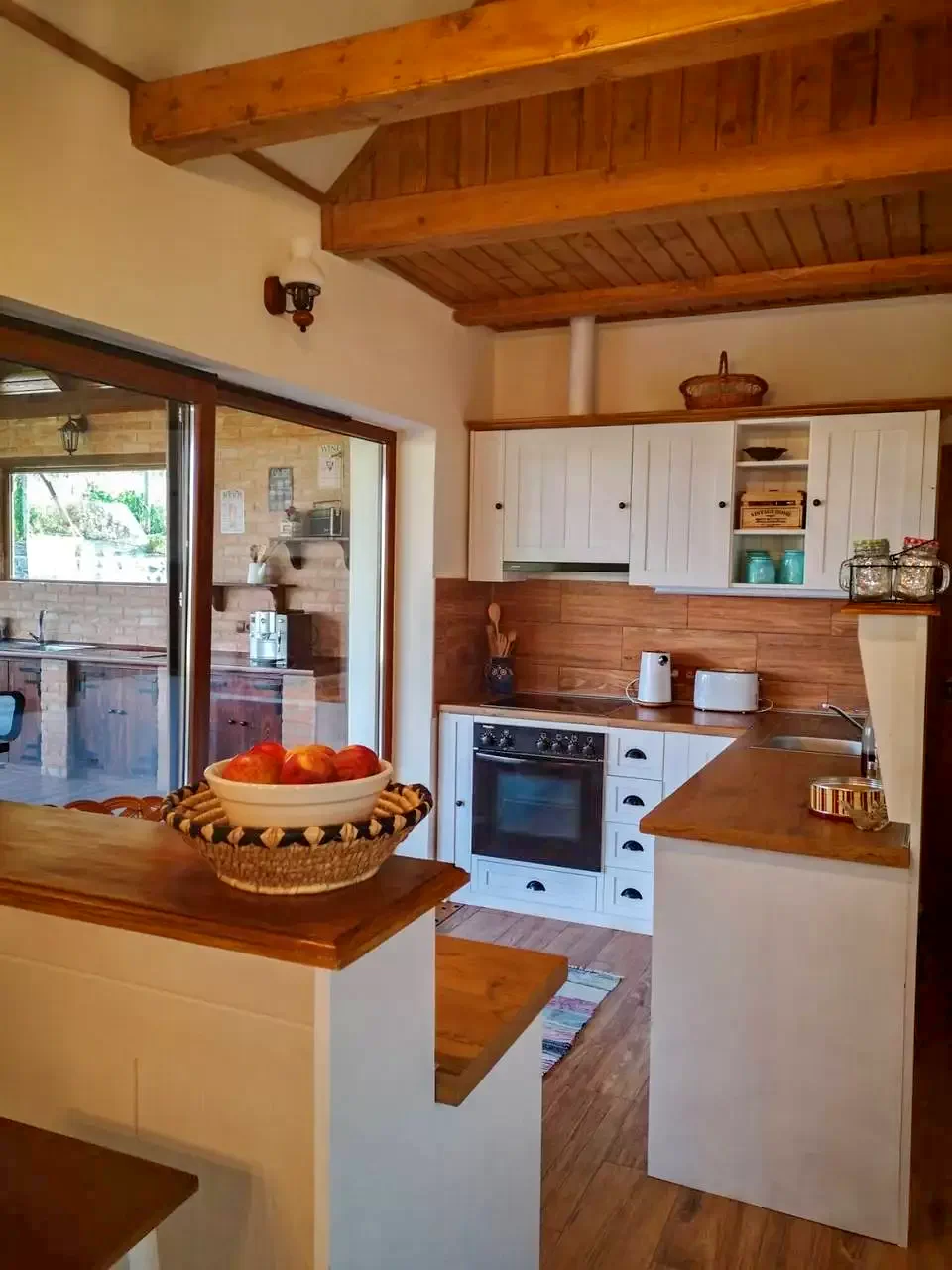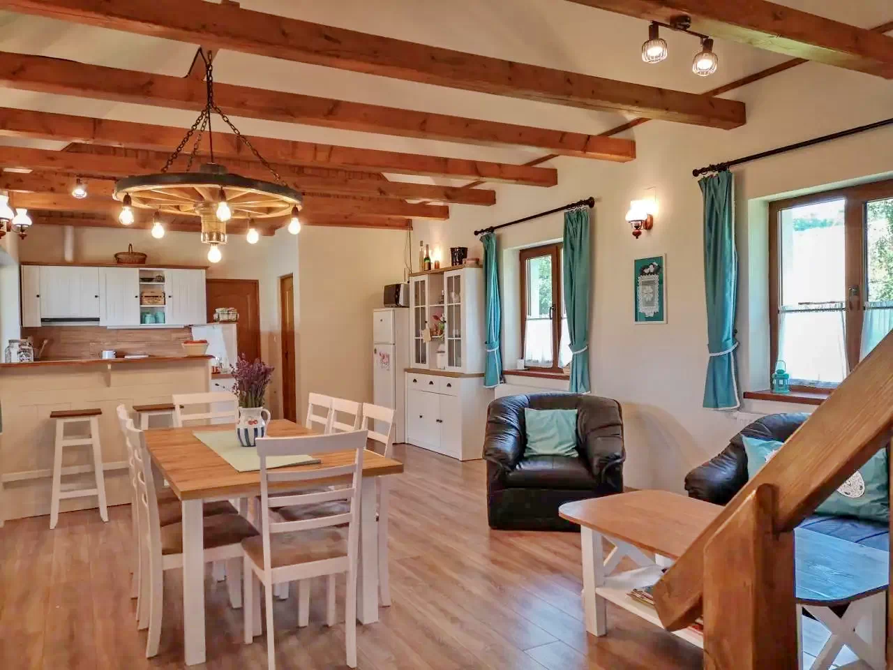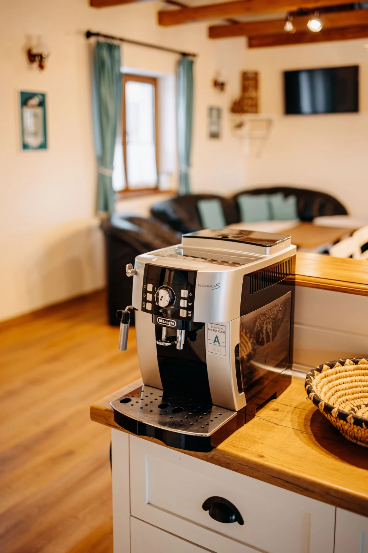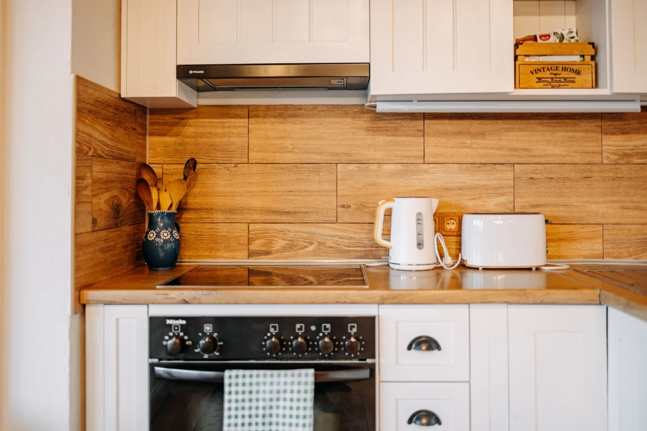 - Bucătăria este complet utilată cu plită, cuptor electric, mașină de spălat vase, cuptor cu microunde, aparat de făcut pâine, ceainic, aparat de cafea și alte ustensile de bucătărie.