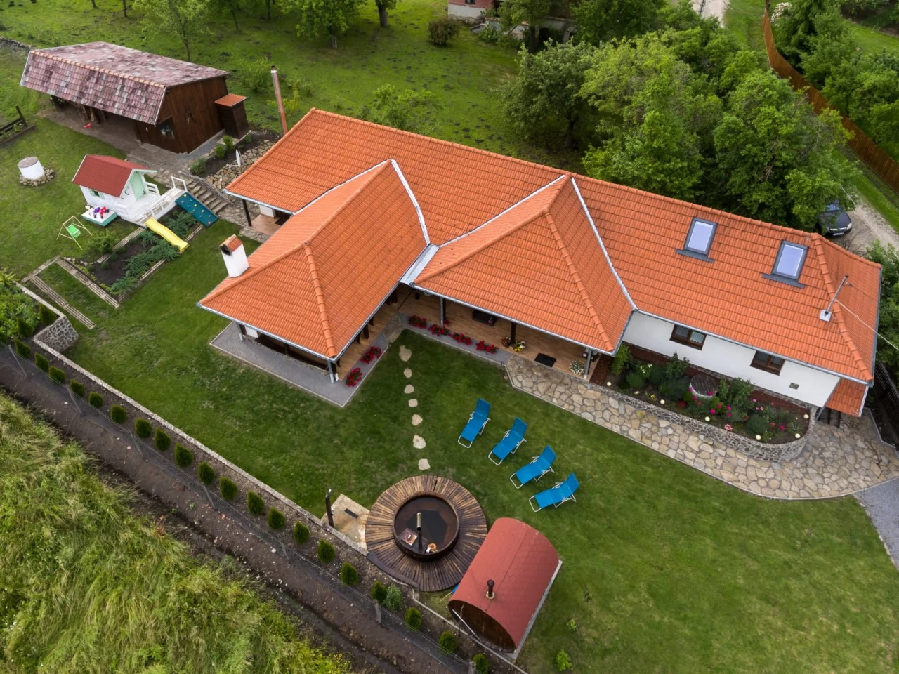 Casa dispune de ciubăr cu apă sarată, saună, grădină verde, facilitati de grill si loc de joacă pentru copii.