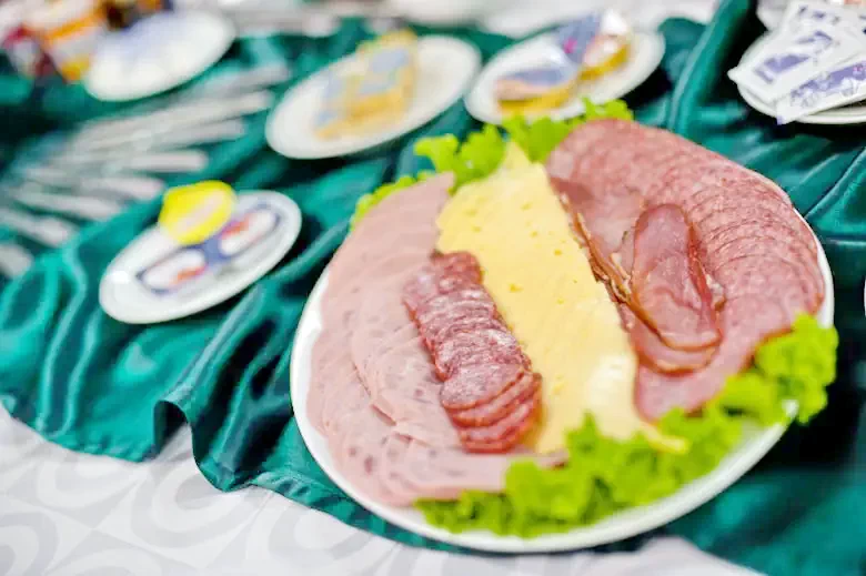 - ouă fierte, cașcaval, șuncă, salam, cotlet afumat, crenvurști, unt, gem,