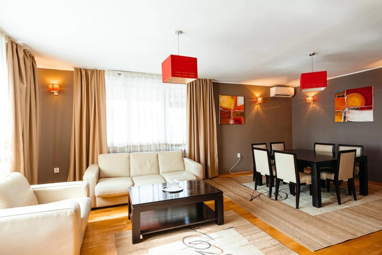 - doua camere si baie spatioase, dotate cu mobila si materiale de calitate ce creeaza o ambianta placuta:
