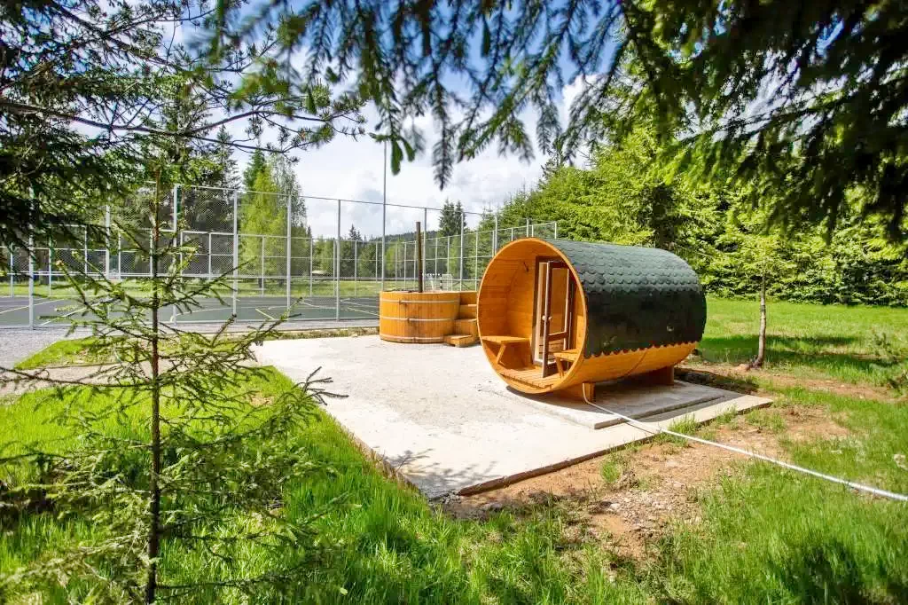 - Oaspeții se pot relaxa la terasă acoperită cu loc de foc, iar pentru momente de destindere completă, sunt disponibile sauna și ciubărul cu apă caldă.