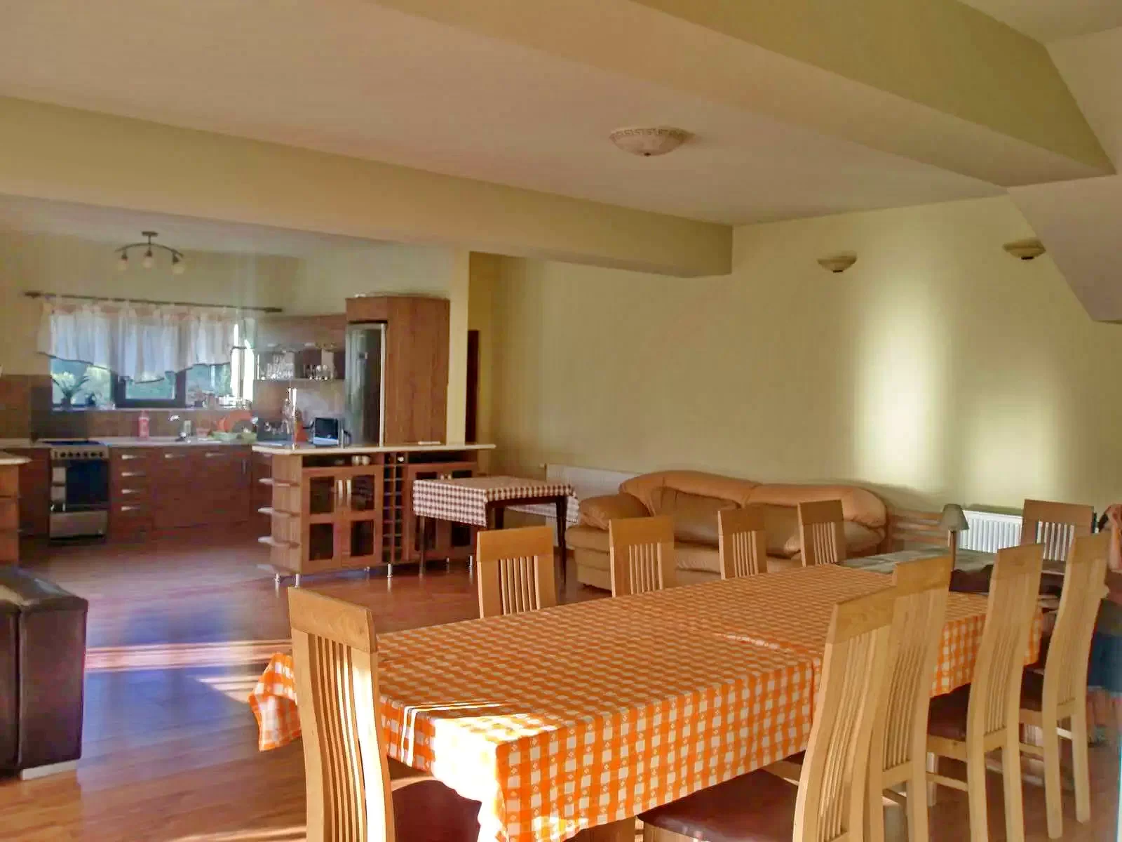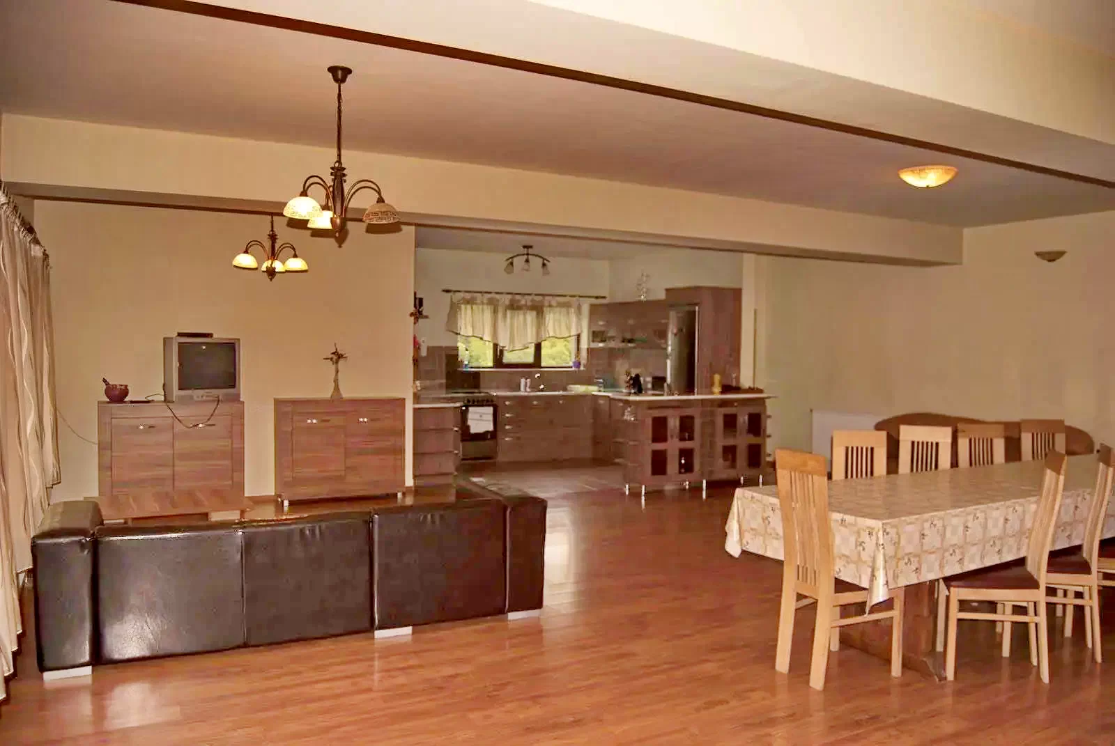 Casa dispune de o bucătărie complet utilată, unde oaspeții își pot pregăti mesele în mod independent. Living-ul extrem de spațios (75 m²) este perfect pentru cine comune, seri relaxante sau întâlniri între prieteni.
