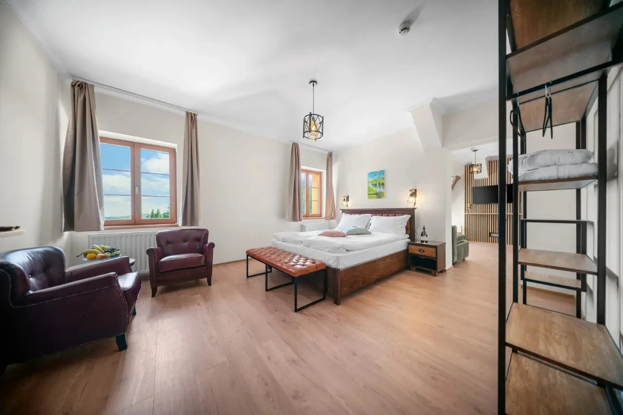 - Superior (30 m², cu pat matrimonial pentru 2 persoane, mobilier premium cu posibilitate de pat suplimentar pt copil)