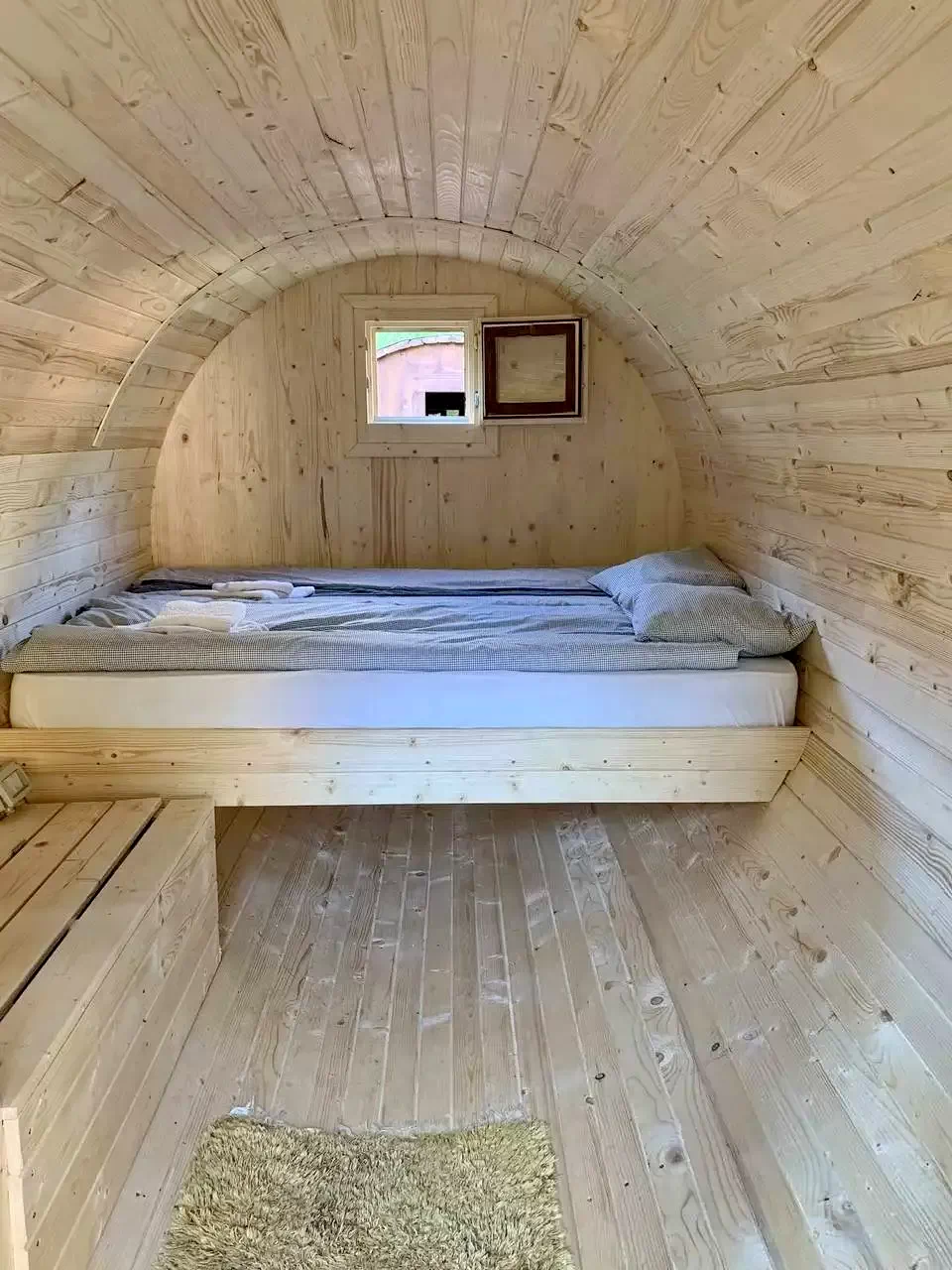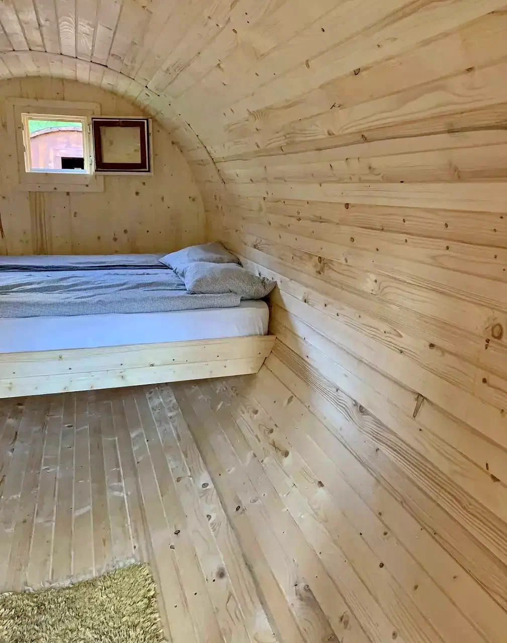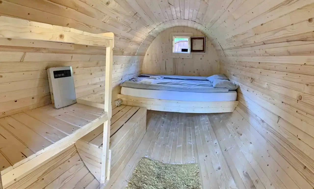 - Fiecare casă butoi dispune de 1 pat dublu și 1 pat simplu.