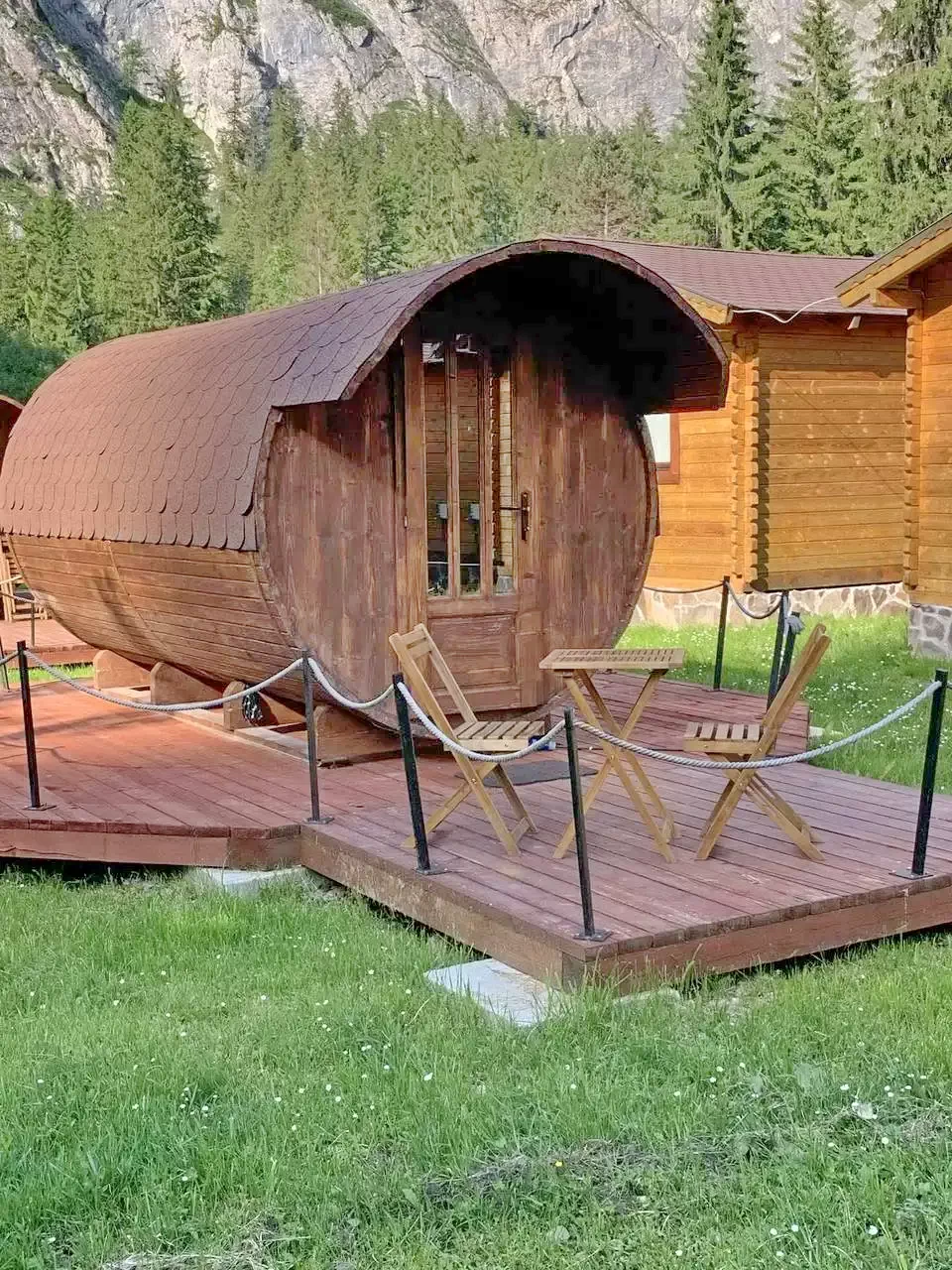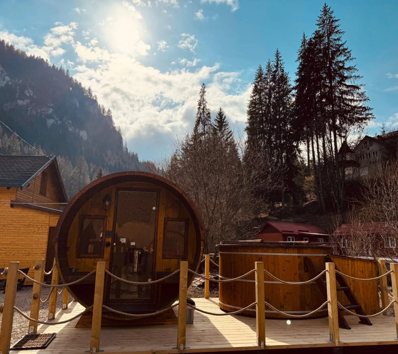 Cazare Lacu Roșu Cabane (cabane de lemn si casute tip butoi) | Wellness: ciubăr, saună; bucătărie, living, WIFI, terasă, grădina, grătar, foișor, parcare | 2 km Lacu Rosu, 3 km Cheile Bicazului, 32 km Lacul Bicaz, 37 km Partia de schi Ciumani