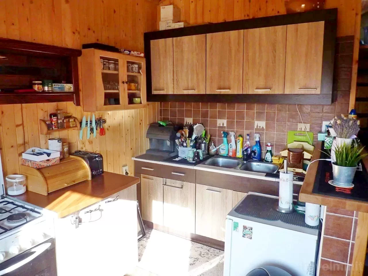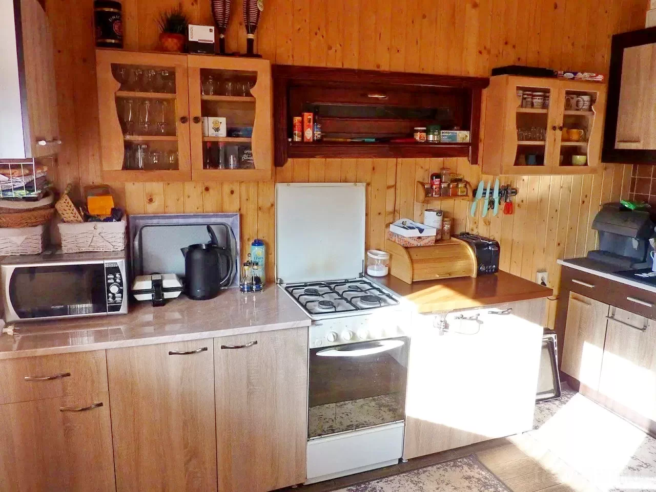 Echipamente de bucătărie: Aragaz pe gaz, frigider, cuptor cu microunde, prăjitor de pâine, filtru de cafea, fierbător de ceai, oală sub presiune, vase, tacâmuri, pahare.