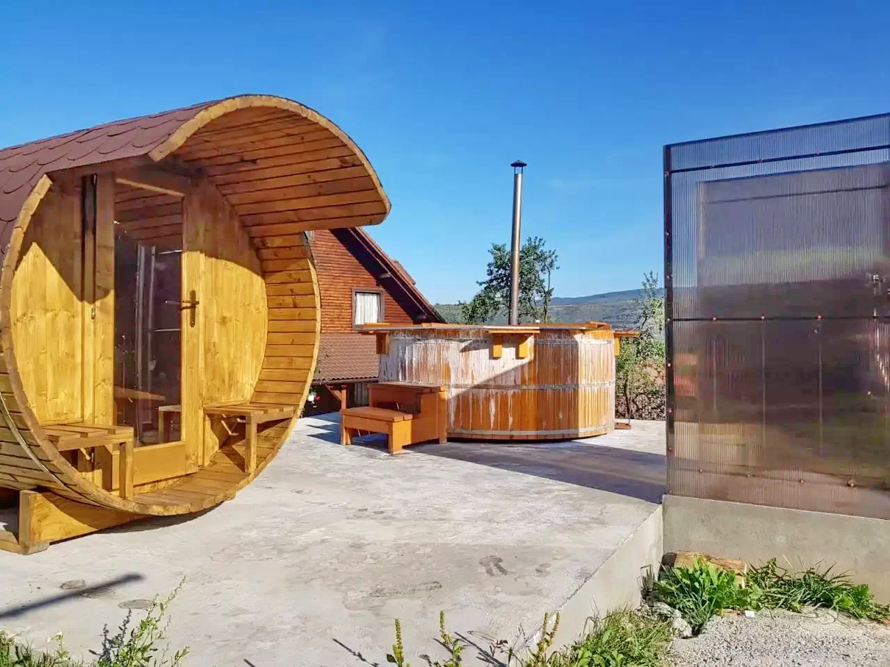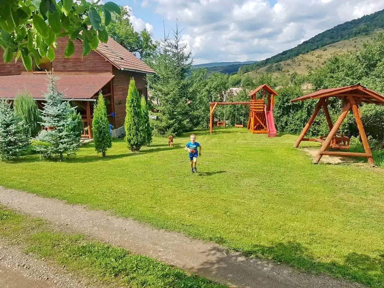 - Gradina mare cu foisor, gratar, loc de parcare, teren de joaca pentu copii cu topogan, leagan, casuta mica, sauna si ciubar, foisor acoperit cu gratar si teren de sport.