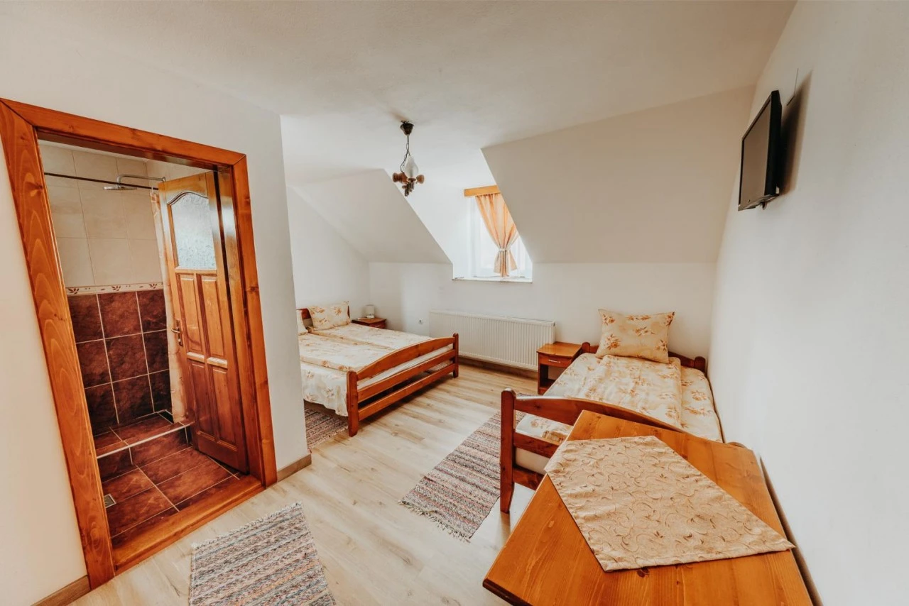 - 4 camere triple: suprafață de 18 m², cu 1 pat matrimonial (1,5 m x 1,9 m) și 1 pat simplu (1 m x 1,9 m), fiecare cu baie proprie, duș, Wi-Fi și TV LED.