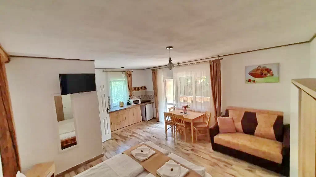 - 1 pat matrimonial mare și 1 canapea extensibilă (pentru 2 adulți și 2 copii sau 3 adulți).