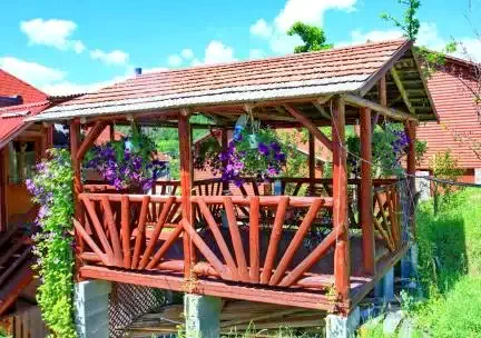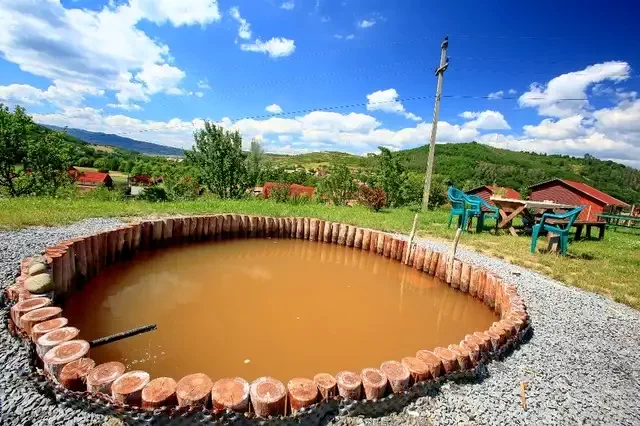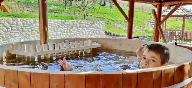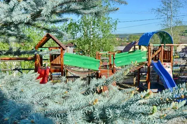 - În curtea amenajată a pensiunii, oaspeții se pot bucura de o cadă cu apă sărată, foișor, mobilier de grădină, grătar și ceaun. Pentru copii există și un loc de joacă.