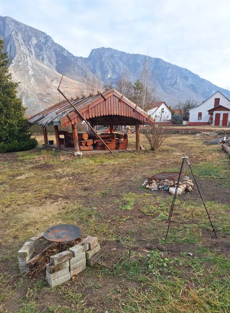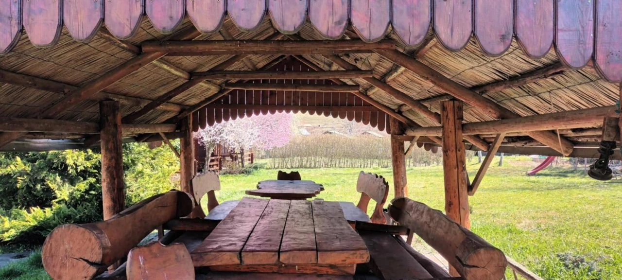 - Casa dispune de două camere cu patru paturi, iar în curte sunt disponibile două cabane din lemn cu câte două paturi și posibilitate de campare.