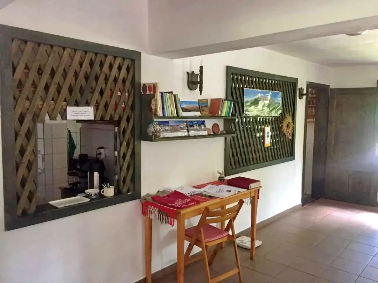 Mesele sunt servite într-o sală de mese rustică și primitoare, care funcționează și ca living pentru oaspeți.