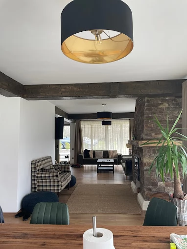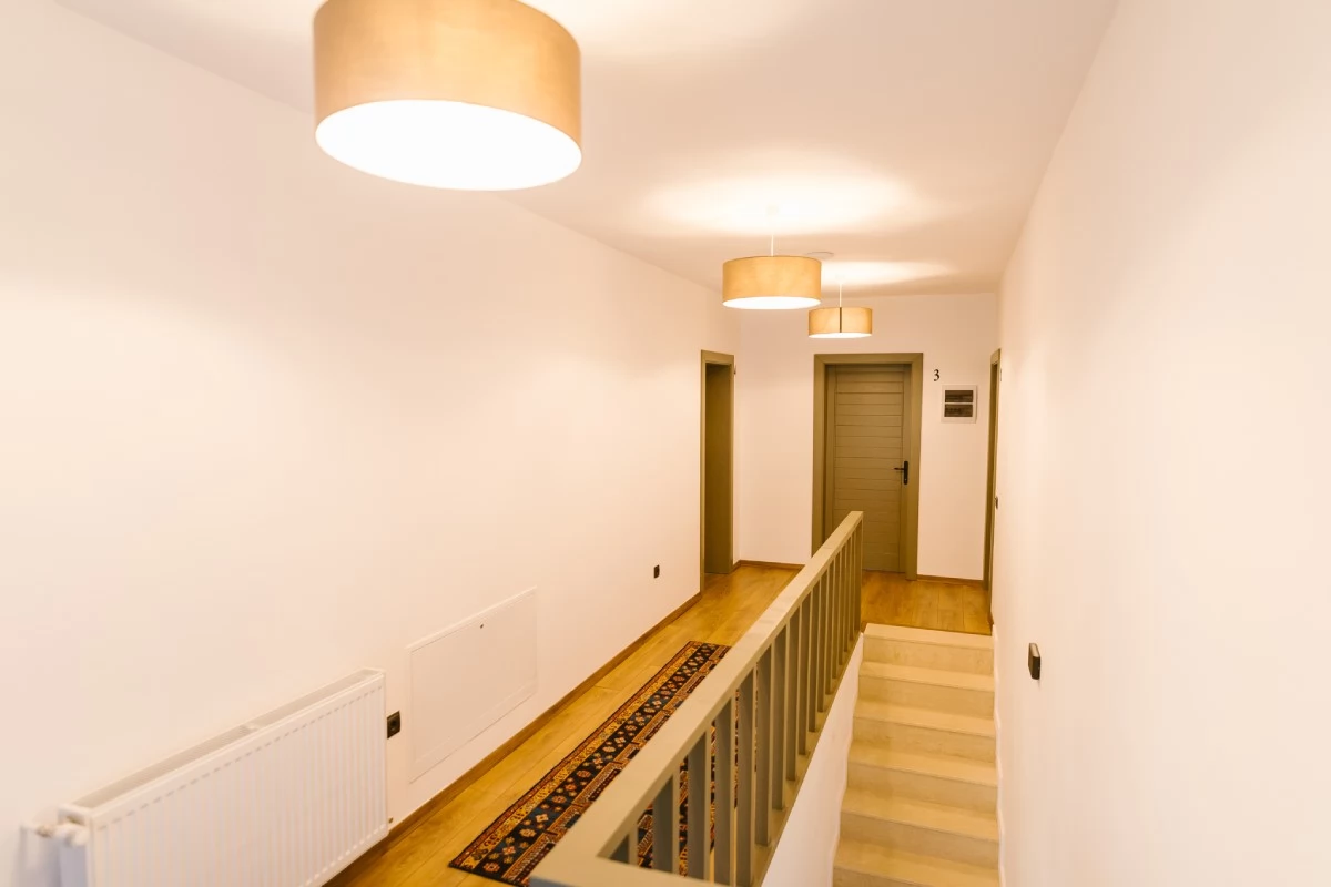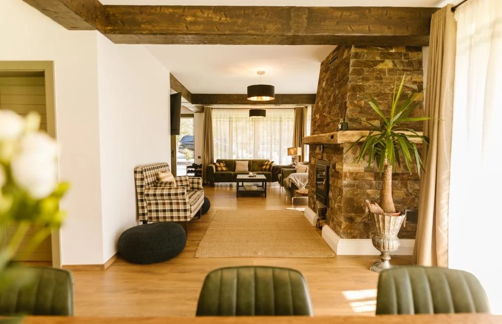 - La parter, găsiți un spațiu deschis cu un design armonios, dotat cu șemineu, care oferă un confort excelent pentru familie și prieteni.