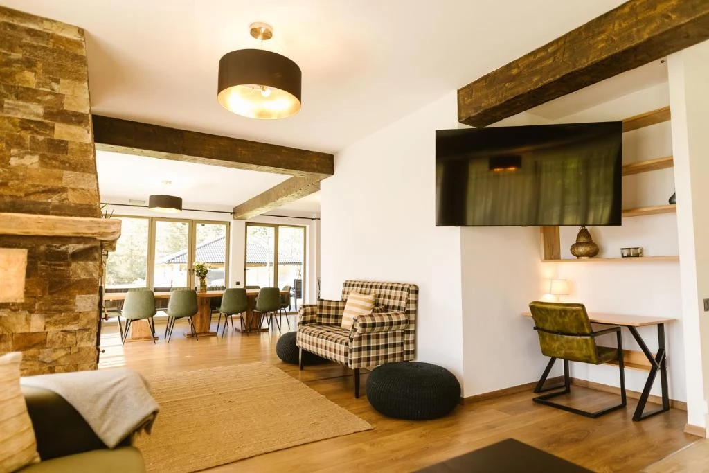 - Casa de lemn pe două nivele reinterpretează stilul chalet modern: tavanul este decorat cu grinzi brute, ferestrele panoramice încadrează perfect peisajul pitoresc, iar șemineul creează o atmosferă caldă și intimă în lunile mai reci.