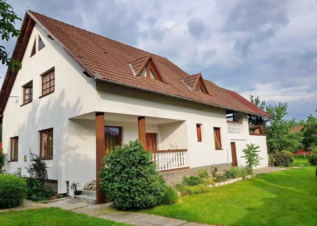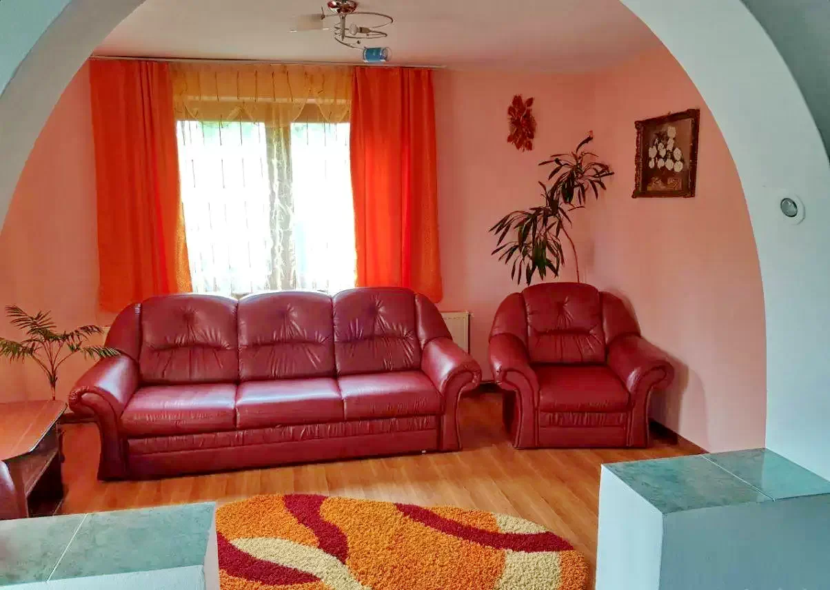 - La parterul casei se afla doua camere, un living, o bucatarie dotata si punct sanitar. La etaj gasim 5 camere cu paturi matrimoniale si o bucatarie dotata.