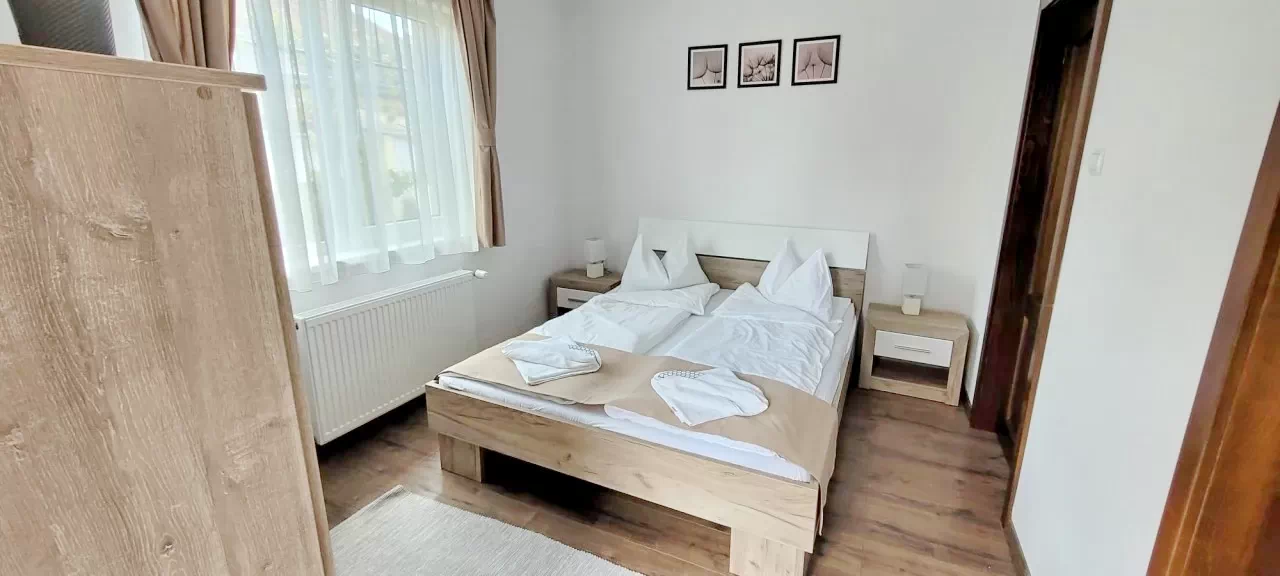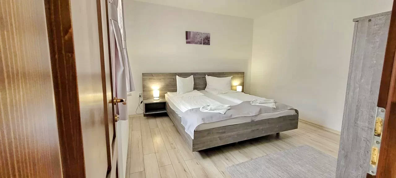 - 2 camere duble cu pat matrimonial, (fiecare cu baie proprie).