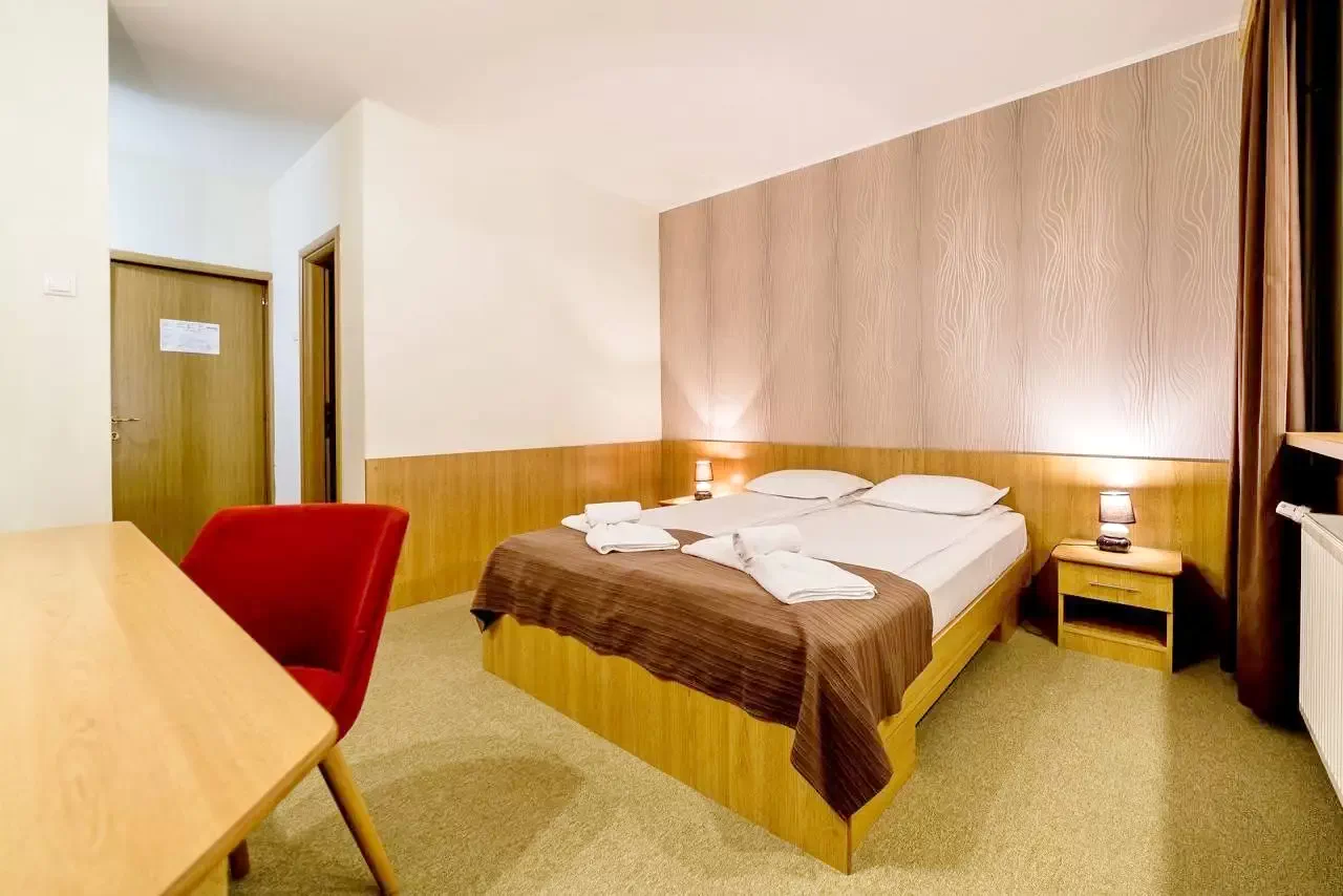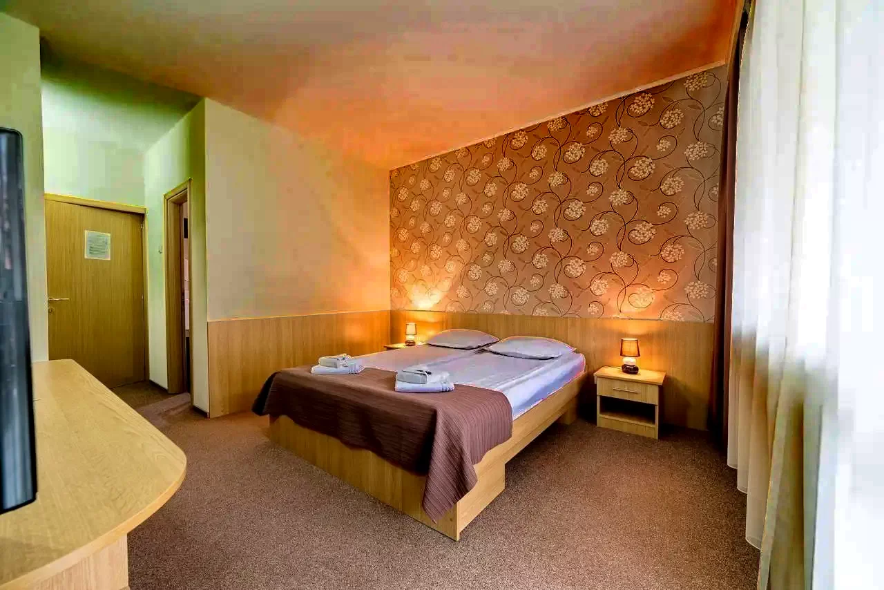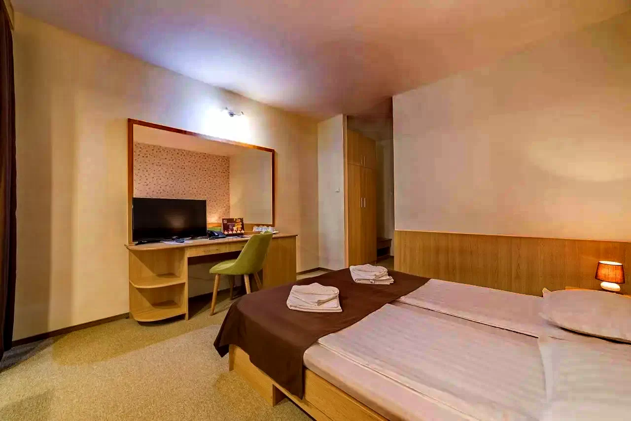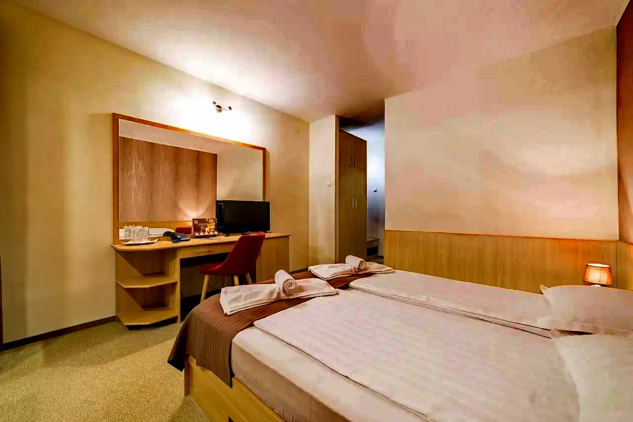- 26 camere duble (cu pat matrimonial sau paturi twin), baie proprie, TV