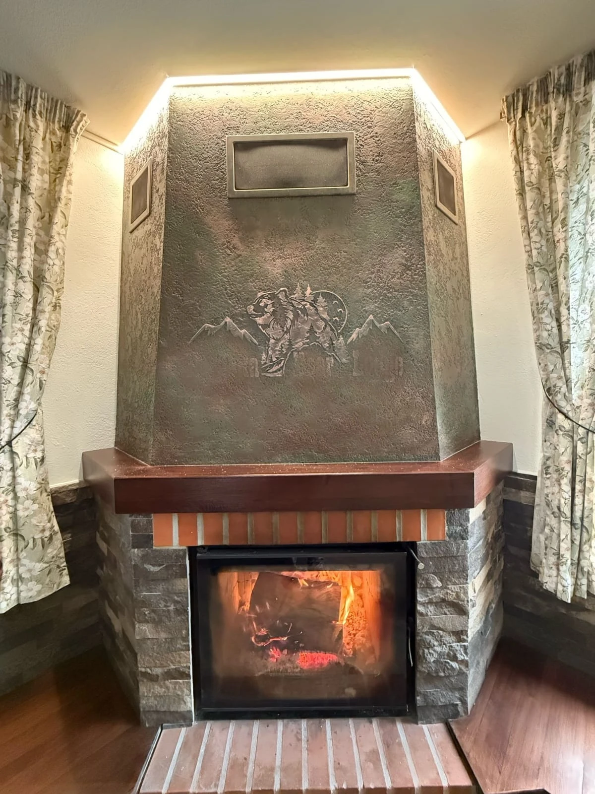 - Living cu șemineu pe lemne și o canapea extensibilă pentru două persoane