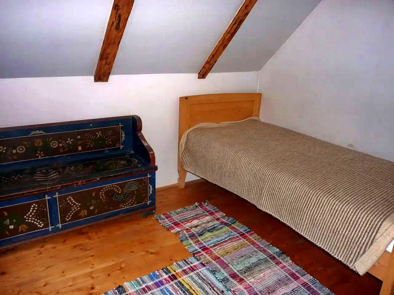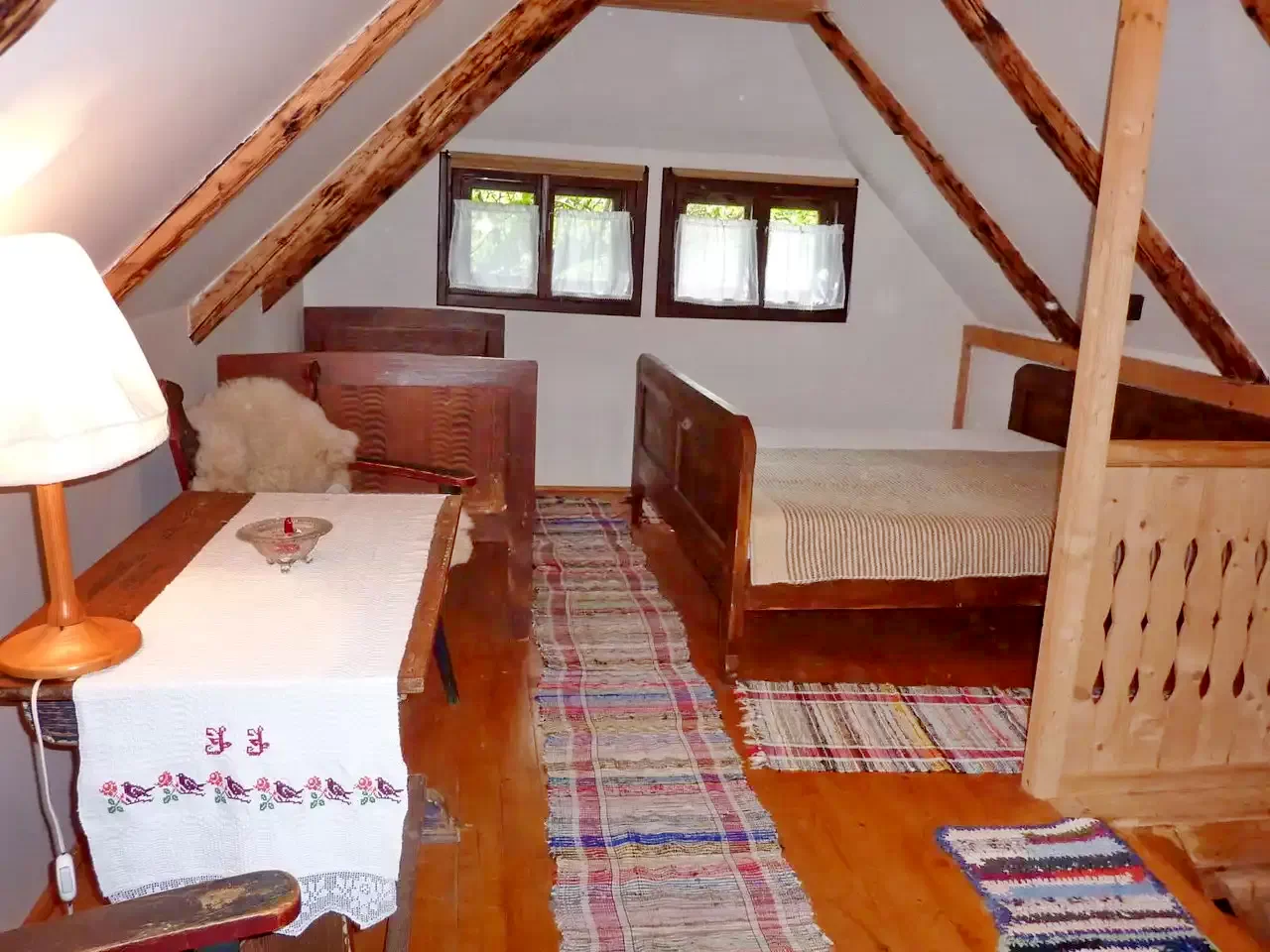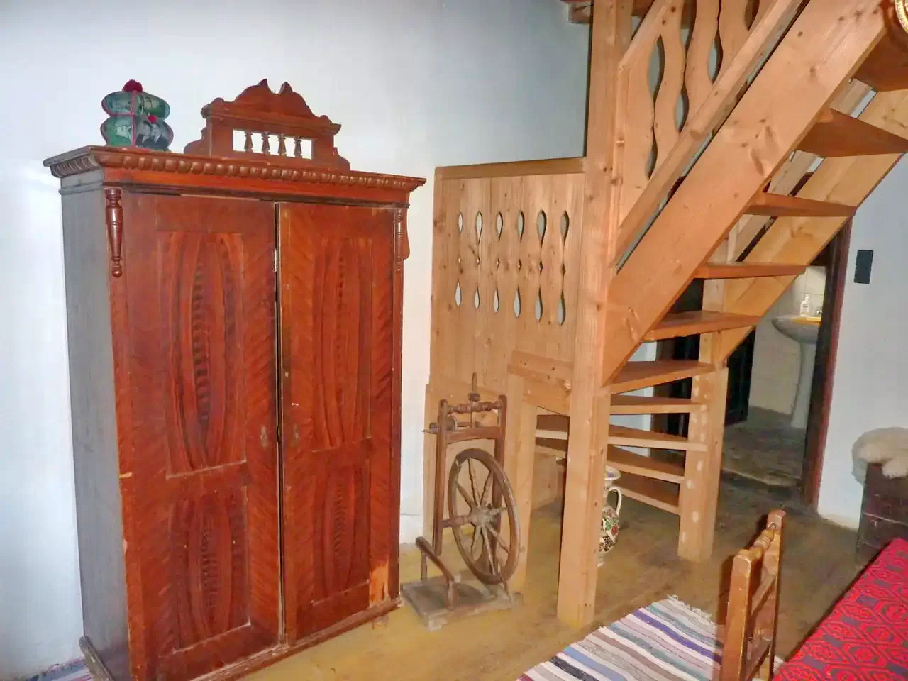 Descrierea unui apartament: La parter se afla o camera cu doua paturi simple. Aceasta camera este dotata cu baie. Din aceasta camera (urcand pe trepte) ajungem in camera de la mansarda. In aceasta camera sunt doua paturi simple si un pat dublu. In total: 6 + 6 pers.