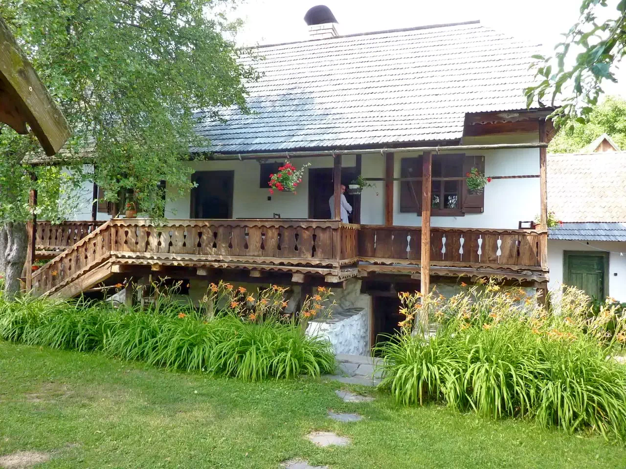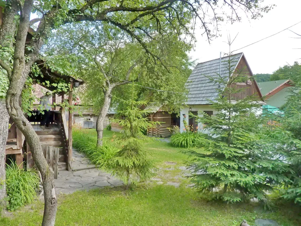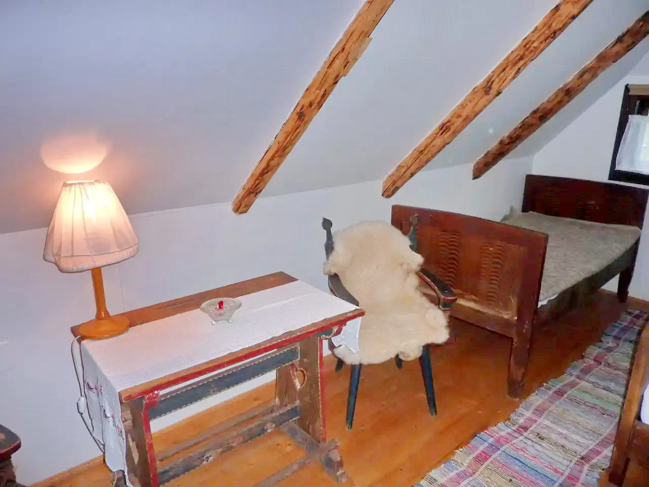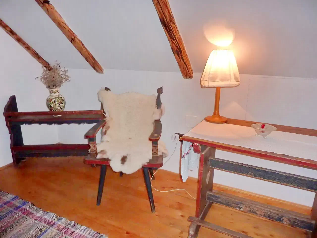 Descrierea unui apartament: La parter se afla o camera cu doua paturi simple. Aceasta camera este dotata cu baie. Din aceasta camera (urcand pe trepte) ajungem in camera de la mansarda. In aceasta camera sunt doua paturi simple si un pat dublu. In total: 6 + 6 pers.