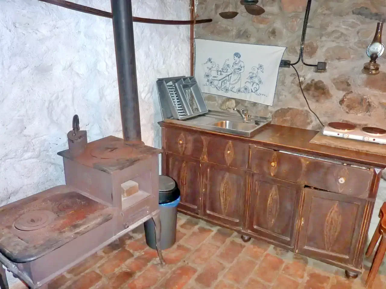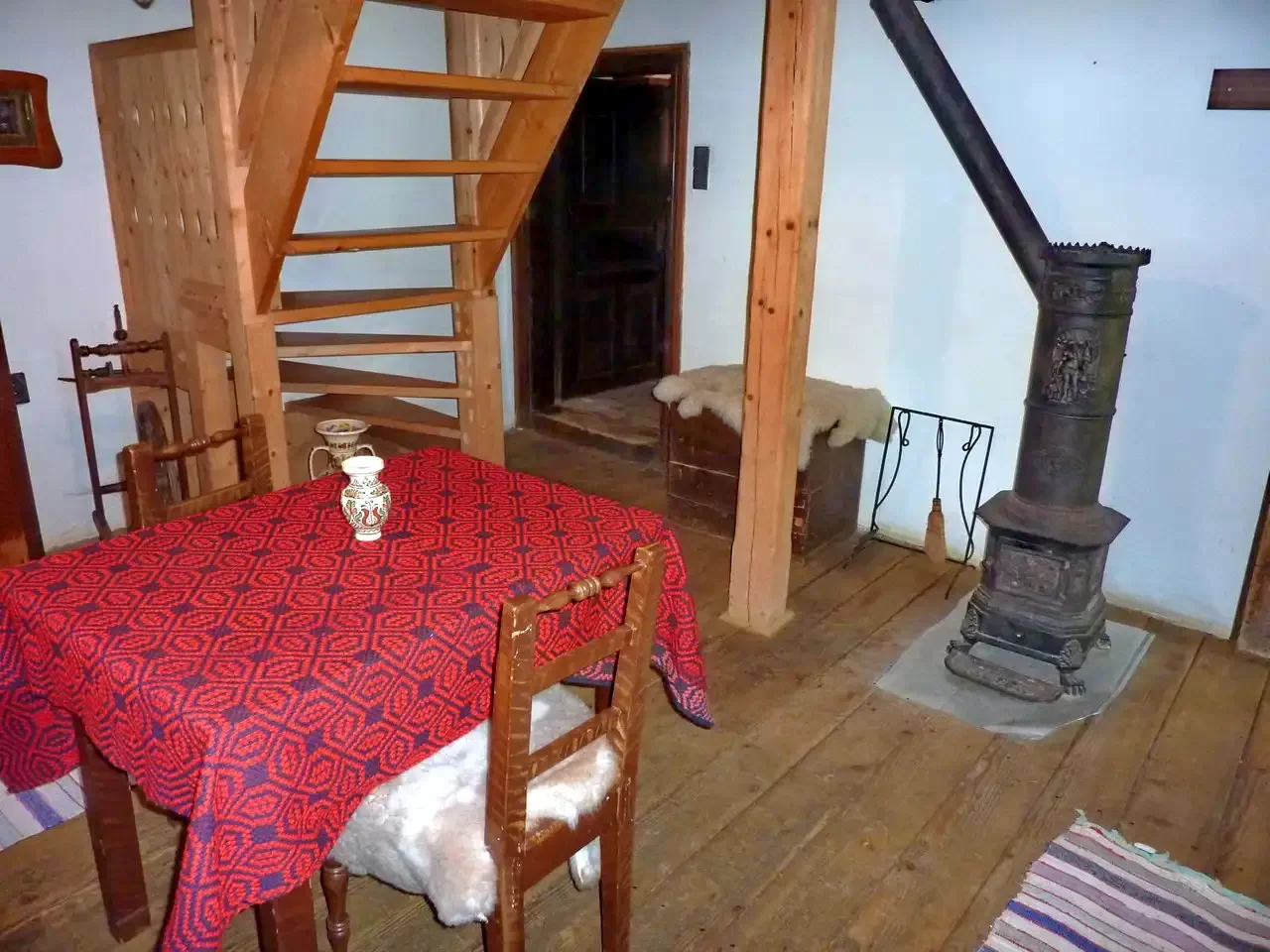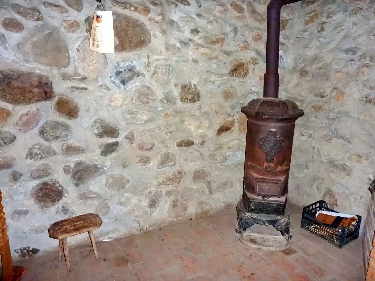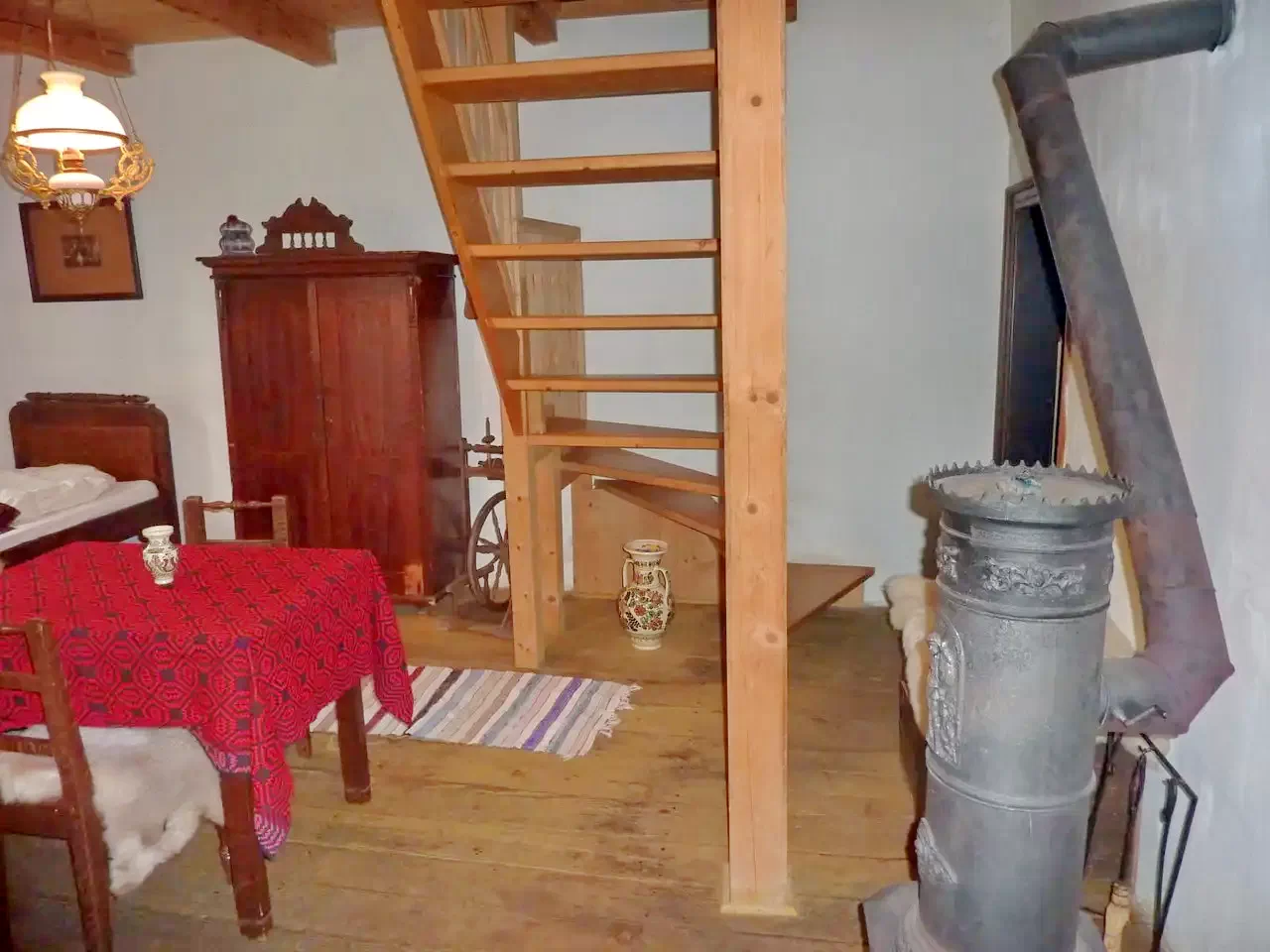 Incalzirea este asigurata cu soba din fonta, cu calorifer electric