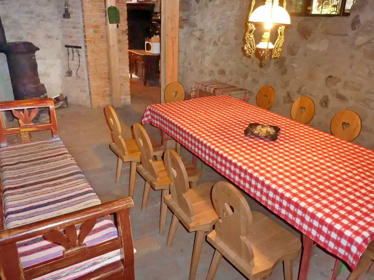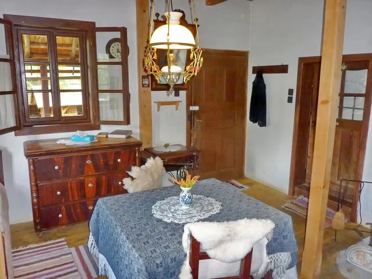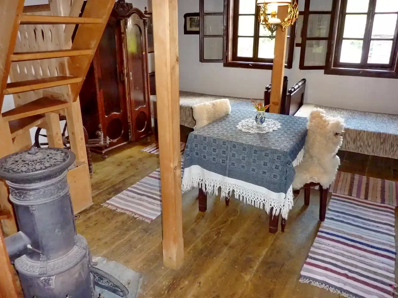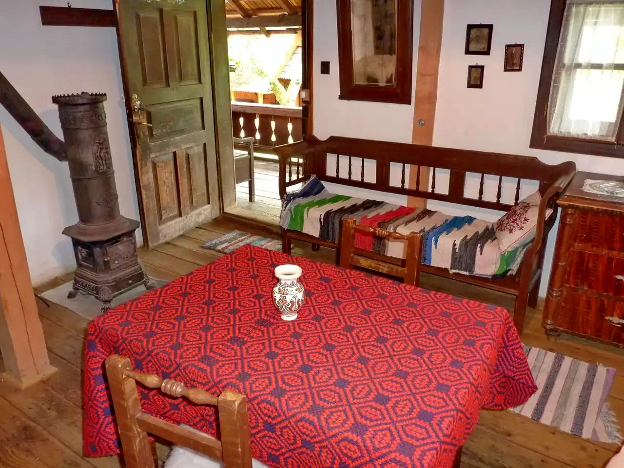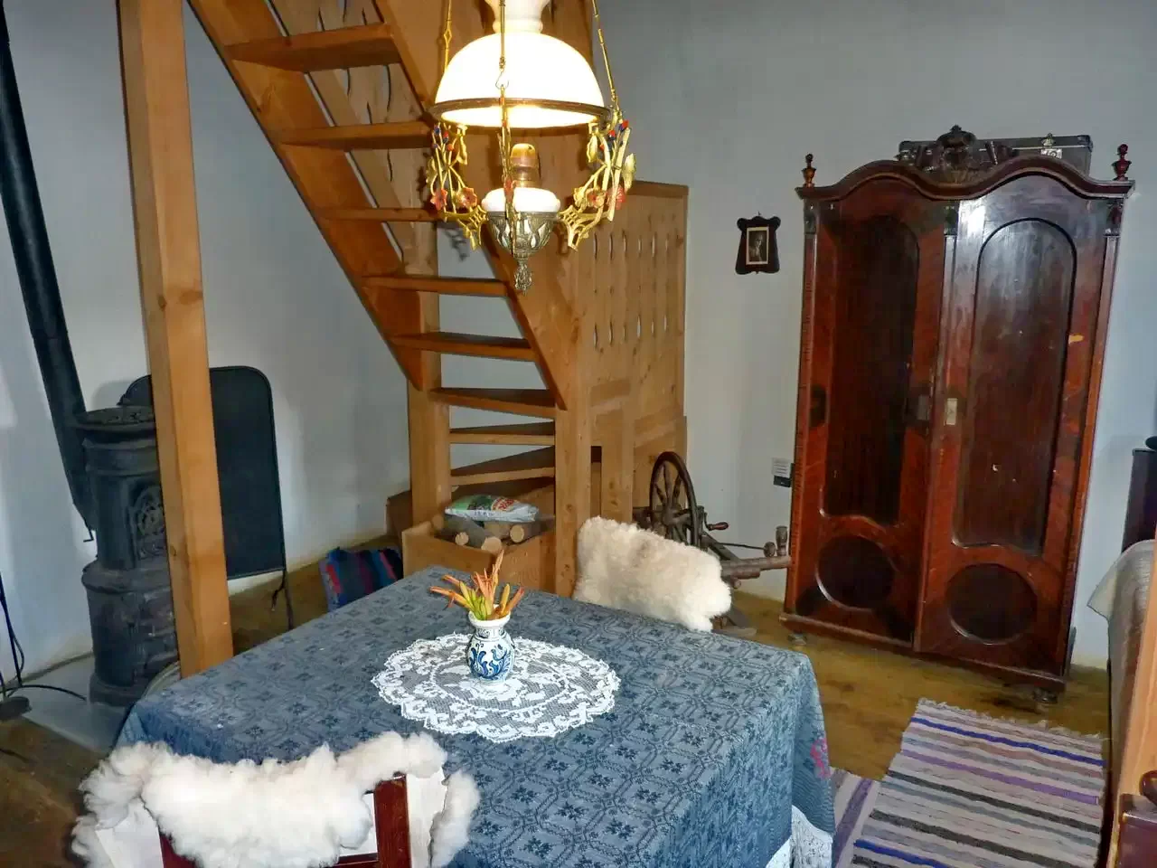Incalzirea este asigurata cu soba din fonta, cu calorifer electric