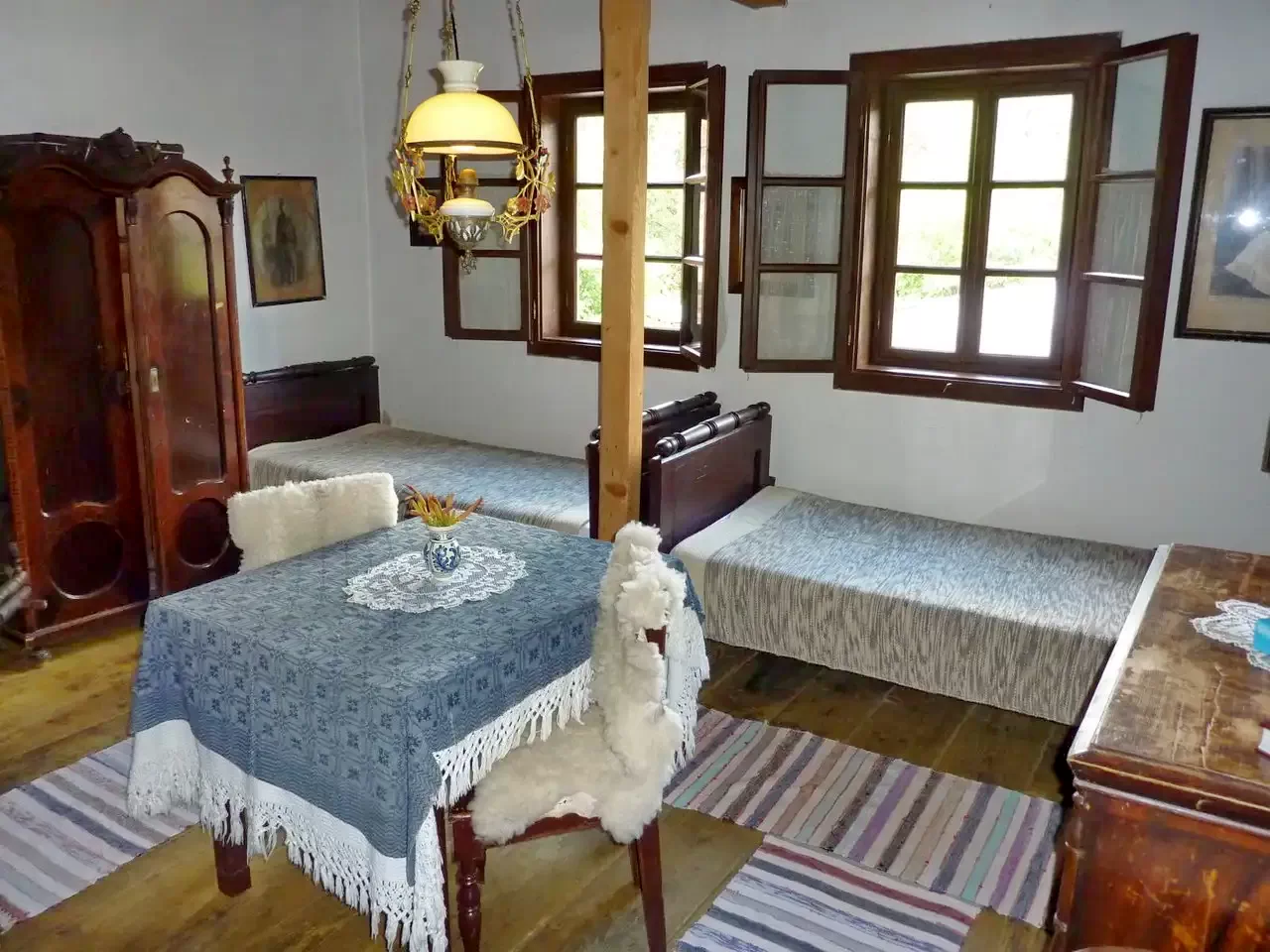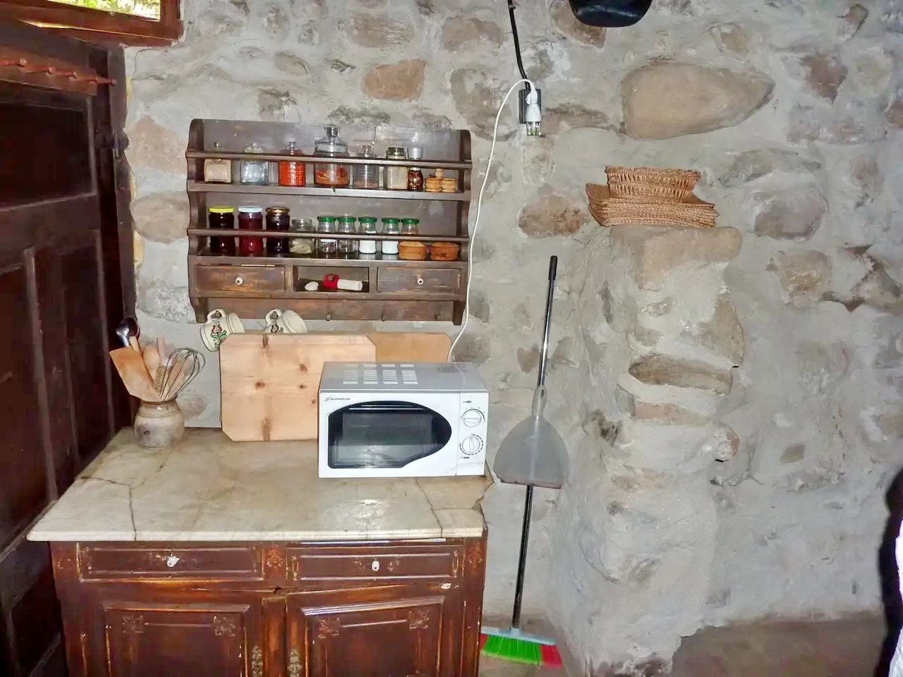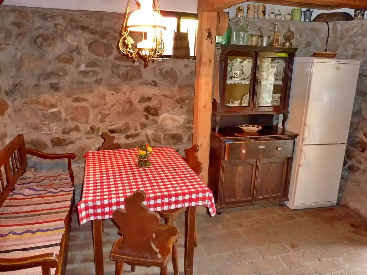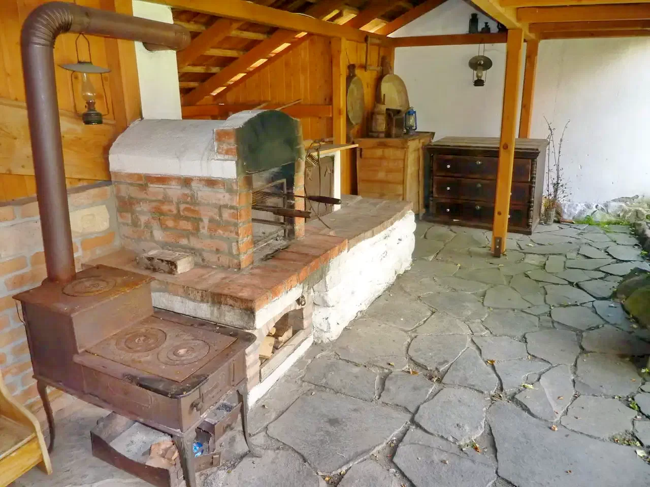 Incalzirea este asigurata cu soba din fonta, cu calorifer electric