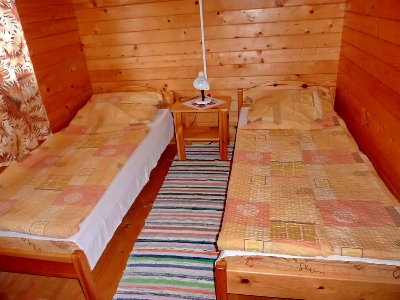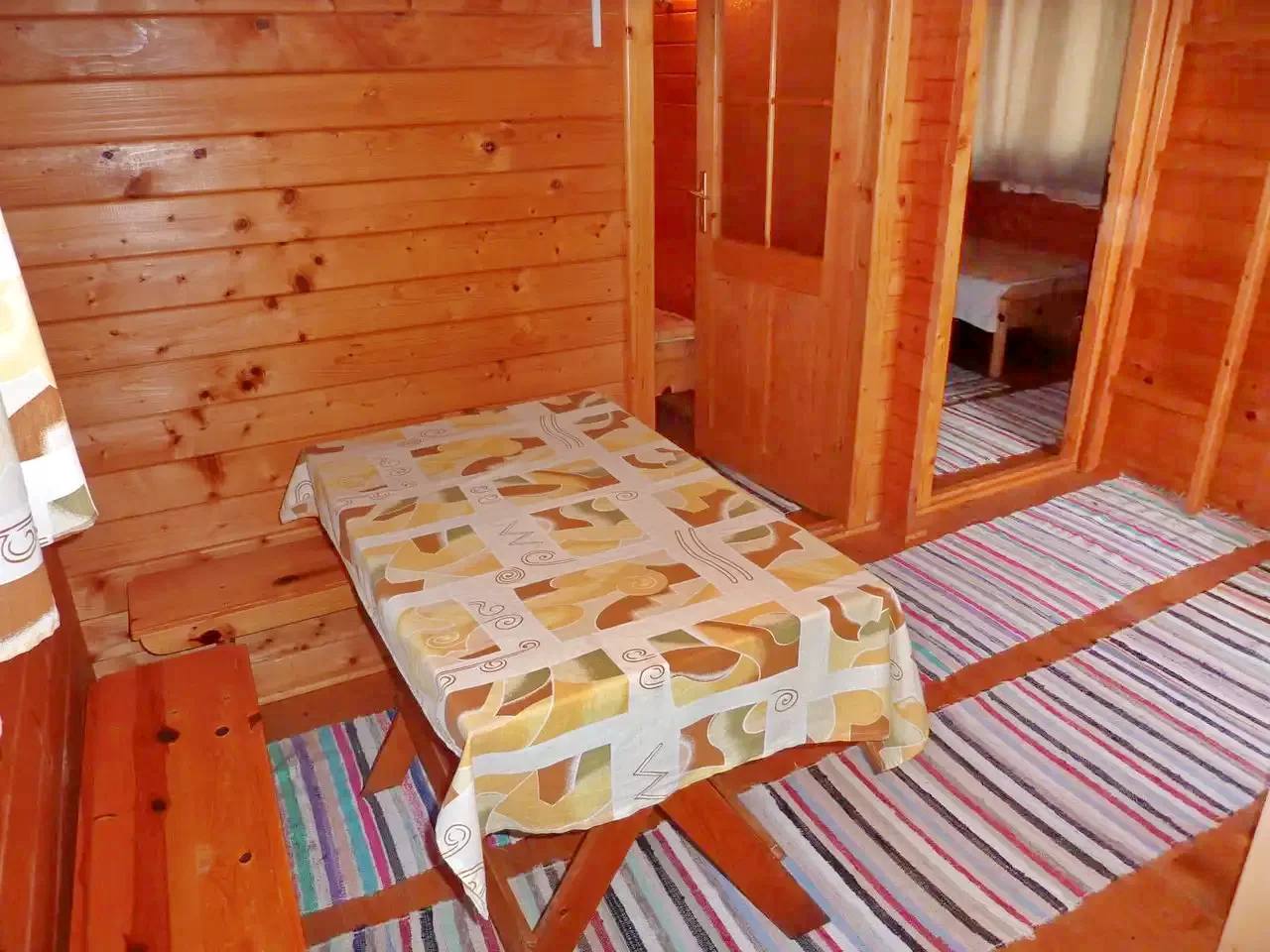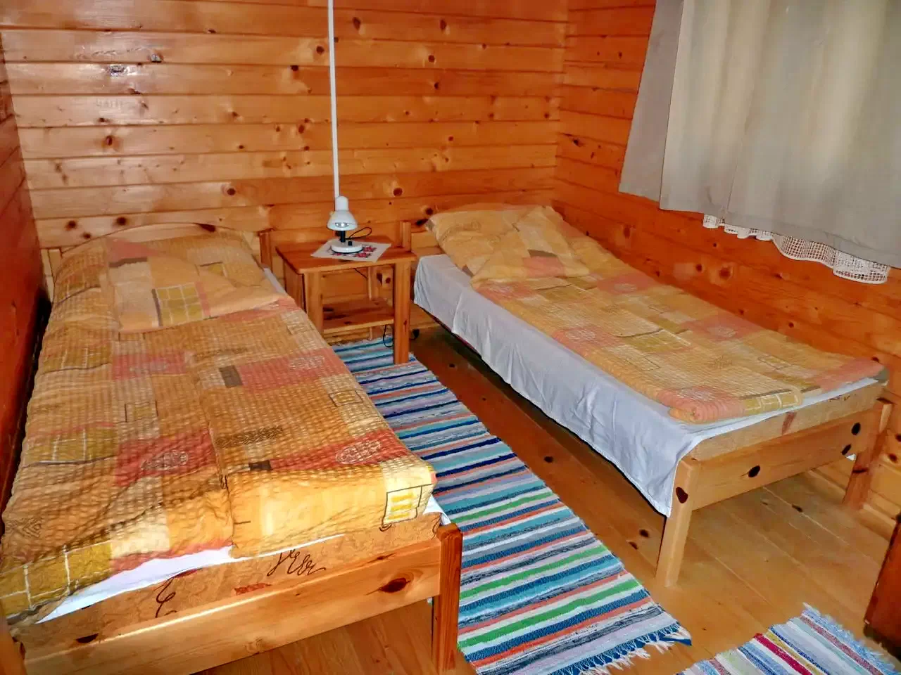 In curte sunt construite trei casute. In fiecare casuta sunt cate doua camere, dotate cu cate doua paturi simple. La nevoie, in mansarda pot fii introduse cate doua paturi de rezerva, pentru fiecare casa in parte. La parter se afla bucataria - camera de zii si baia. (In total: 3 X 4 + (3 X 2) persoane!)