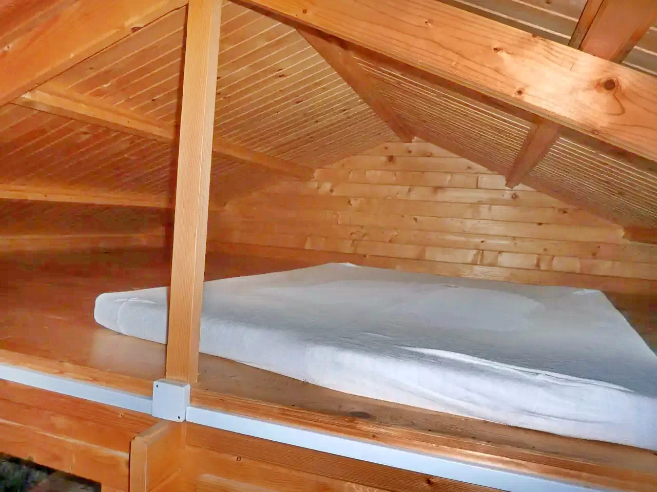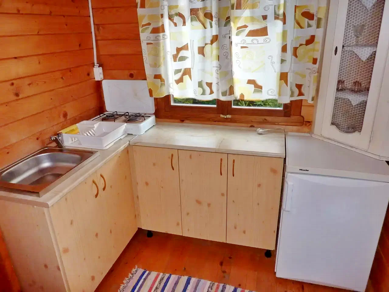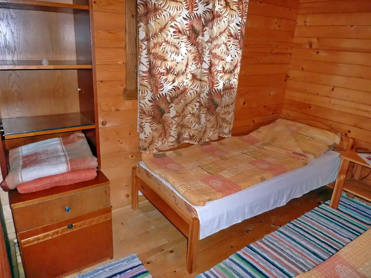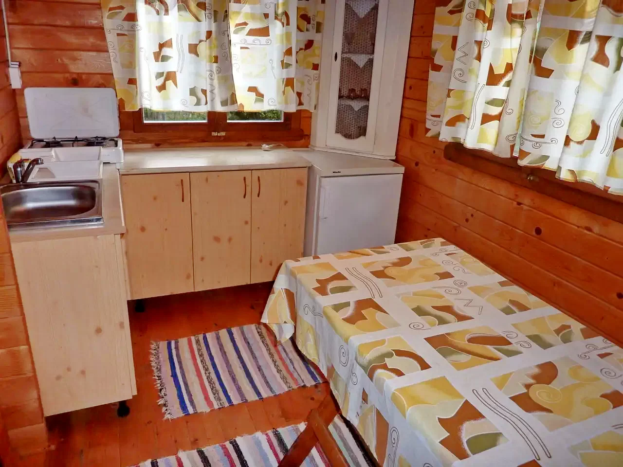 In curte sunt construite trei casute. In fiecare casuta sunt cate doua camere, dotate cu cate doua paturi simple. La nevoie, in mansarda pot fii introduse cate doua paturi de rezerva, pentru fiecare casa in parte. La parter se afla bucataria - camera de zii si baia. (In total: 3 X 4 + (3 X 2) persoane!)